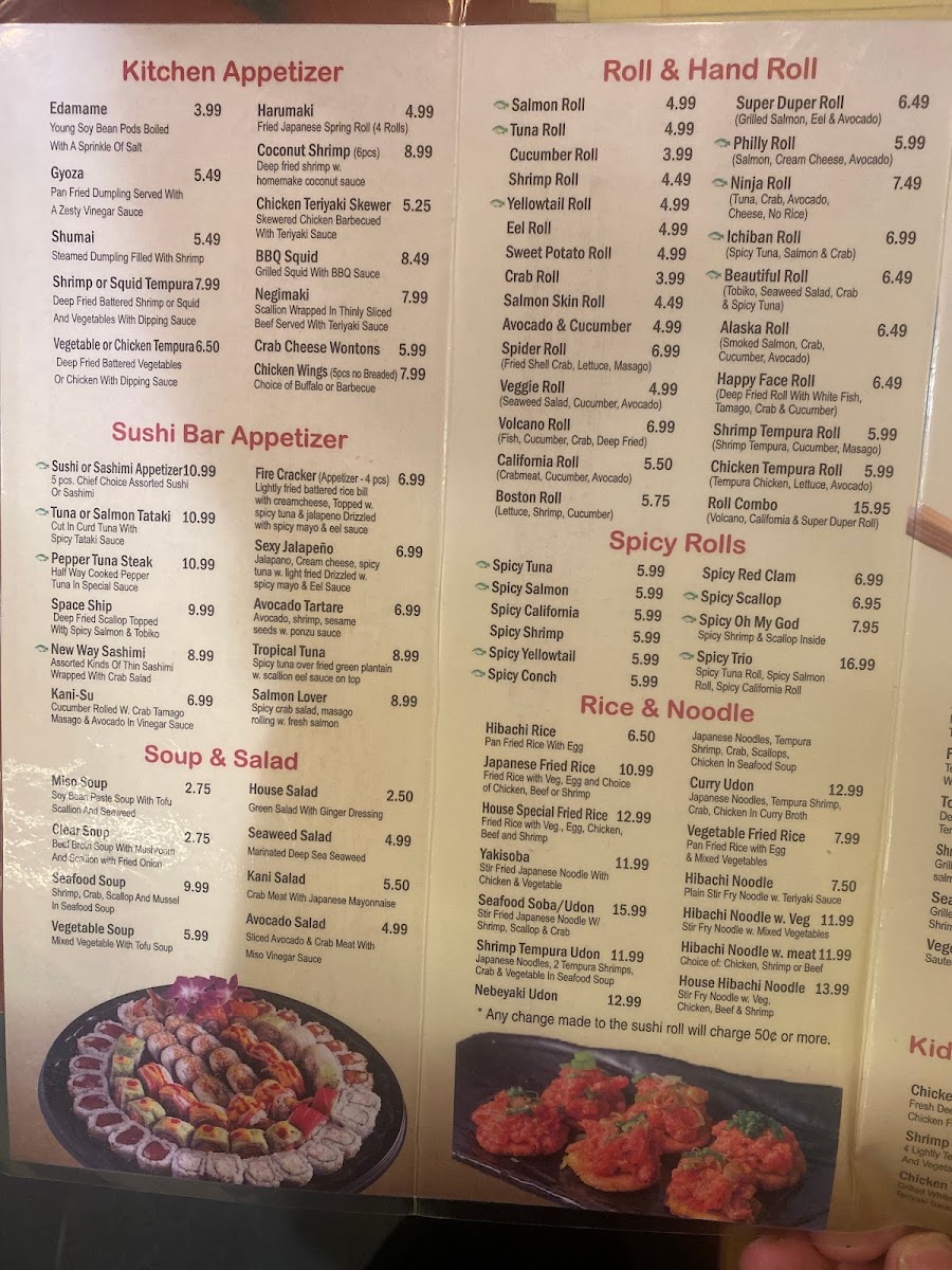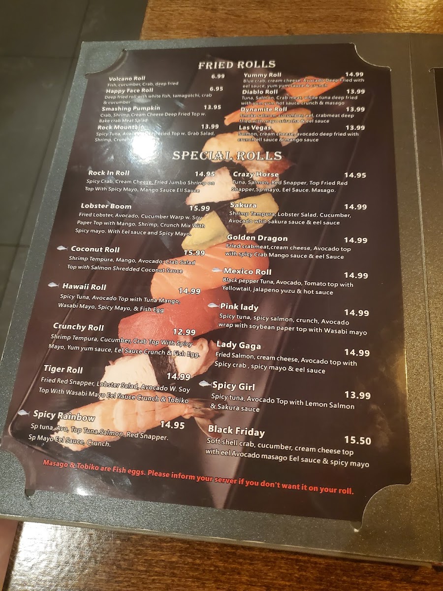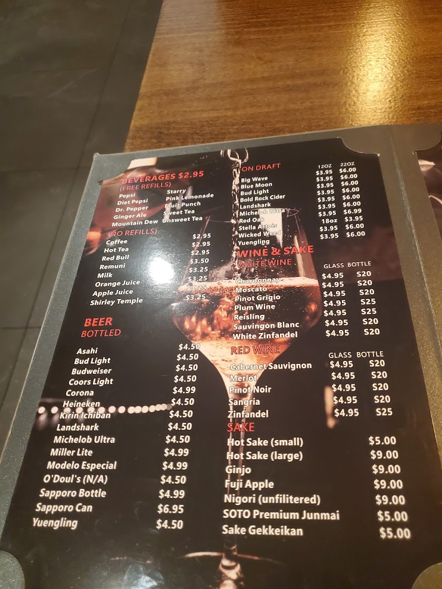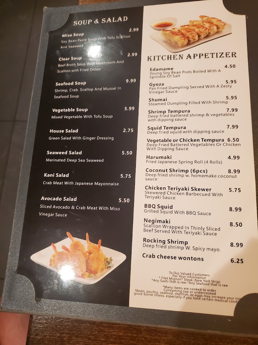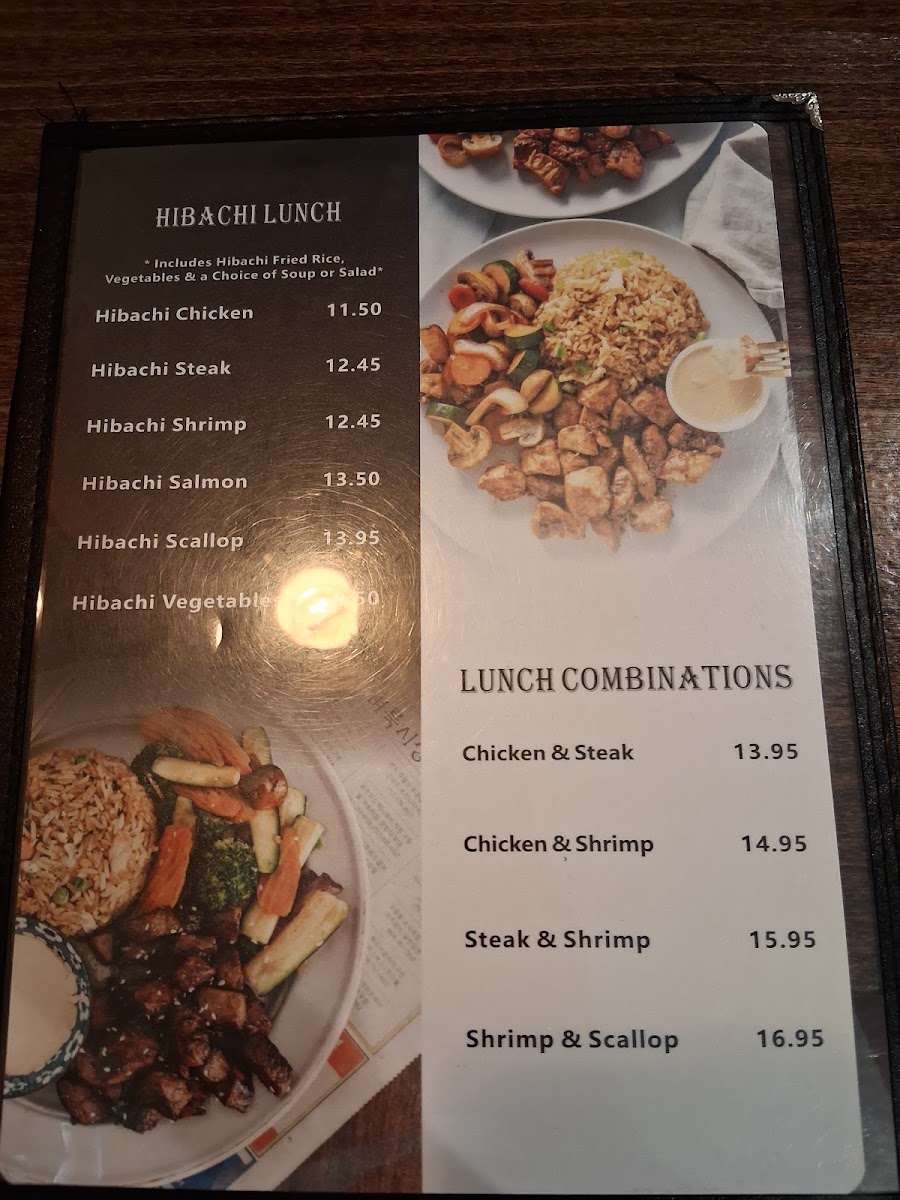 Soups and salads, including Miso Soup and salad with ginger dressing, provide light and comforting starters, while the hibachi section features vibrant dishes like Hibachi Chicken with vegetable fried rice, perfectly matching the engaging atmosphere of live cooking. The sushi and sashimi dinners offer elegant, fresh flavors that can be savored slowly, making them ideal for those seeking a calm and refined dining moment.
